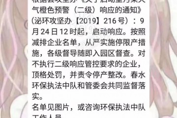 @【通知】春水鎮各石材加工企業:根據縣攻堅辦《關于啟動重污染天氣橙色預警(二級)響應的通知》(泌環攻堅辦【2019】216號):9月24日12時起,啟動響應。按照減排企業名單,從嚴實施停限產措施,各級督導隨即入…