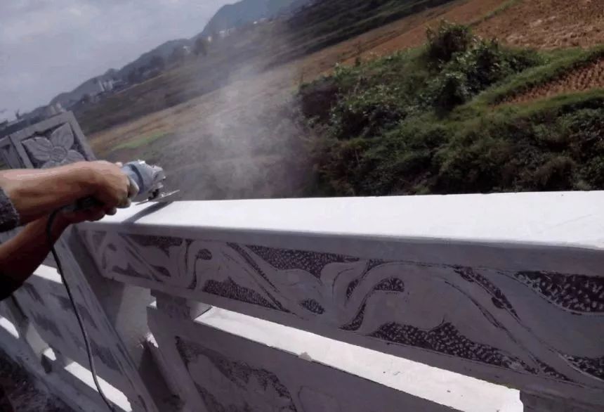 青石欄桿安裝好后,應對立柱、扶手等各部位進行缺棱掉角的情況檢查,采用云石膠加少許普通硅酸鹽水泥(調色,使打磨后與原青石色澤一致)對缺棱掉角的缺陷進行修補,干硬進行打磨,保證石欄桿整體美觀。