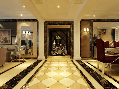 2.建材運用——(1)大理石與地板,采用石材進行鋪設顯得大氣。若是普通居室,客廳與餐廳最好還是鋪設木質地板;(2)多彩和精美的織物、毛毯,柔軟的織物與毛毯是歐式風格的重要材質表現;(3)有特色的精致印花圖案墻紙,另外如畫有圣經故事以及人物等內容的墻紙也是典型的歐式風格建材。