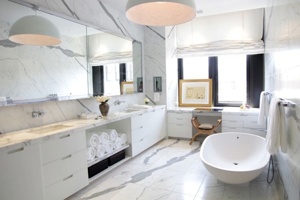 大理石是一種多功能的材料,可以雕刻成各種不同的藝術品來美化空間,這間寬敞的大理石浴室又是一個好例子,如何使用大理石在現代住宅中,記住的你生活習慣,細節和空間規劃是必不可少的。