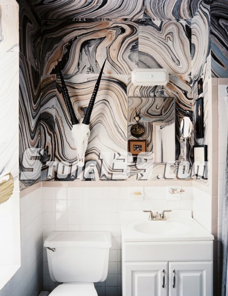 豐富紋理的大理石浴室可以分割空間本身就是一種設計手段,木柜溫暖了整個冰冷的空間。墻上的斑馬賦予空間一種野生的感覺,明亮的自然光沉寂在整體氛圍。