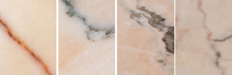 2-不同色紋理:底色呈粉紅色,但伴有褐色、綠色或深藍(lán)色紋理。是開采最多的種類,占40%。