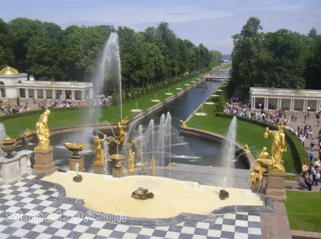 18世紀中葉,為紀念俄國在北方戰爭中的勝利,在“彼得大帝夏宮”的前面建造了一個由64個噴泉和250多尊金銅像組成的梯級大瀑布。