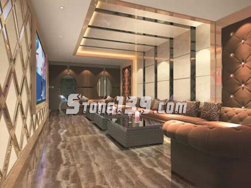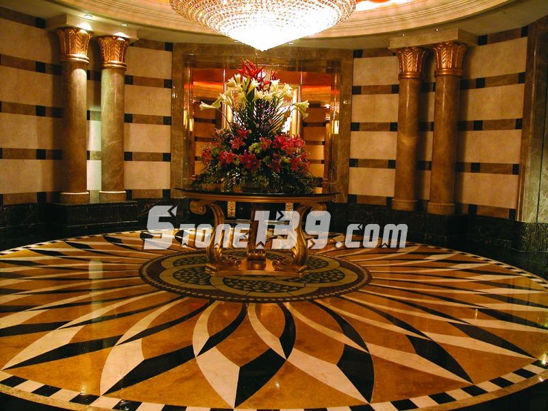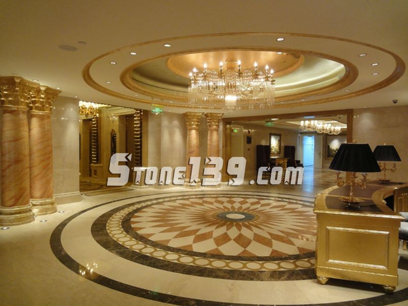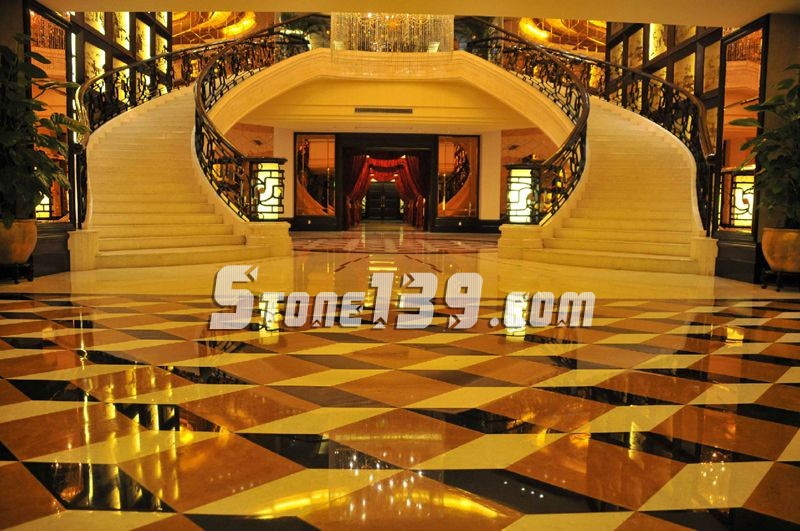 三色大理石菱形拼貼 其中橙紅色是亮點 顏色搭配很養(yǎng)眼 配合燈光的映射 地板顯得金碧輝煌又不土氣