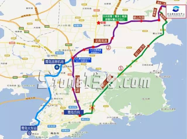 城陽方向車輛G2011青銀高速城陽南出口---S19龍青高速惜福鎮出口---龍青高速即墨東鰲山衛出口---鶴山東路---濱海大道(海陽方向)---博覽中心