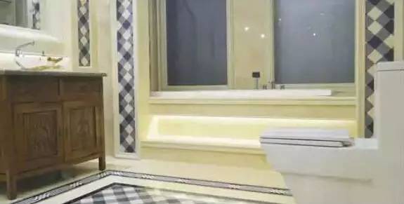 石英石的拼接設(shè)計也是可以花樣百出的,在仿古浴室柜與白色馬桶之間,它規(guī)劃出自己的界限,長方形的邊界之內(nèi),是石英石材質(zhì)的霸氣彰顯,可遠觀,可近看,細微與粗獷兼而有之。