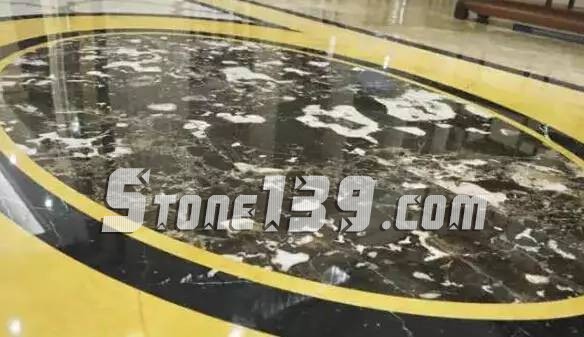 過道以方圓圖形展示,寓意沒有規(guī)矩不成方圓,黑色與金黃色的色系搭配,令空間大氣莊重,環(huán)形圖案內(nèi)的石材運用,頗具獨到之處,斑斕,深沉,有內(nèi)蘊乾坤之感。