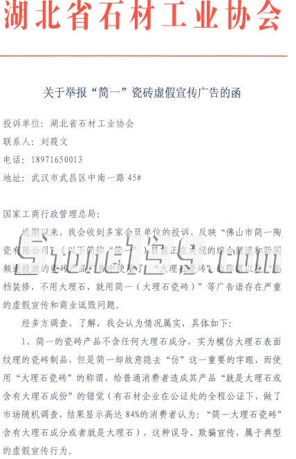 8月26日,湖北省石材工業協會正式向國家工商總局及中央電視臺提交投訴函,舉報佛山市簡一陶瓷公司(以下簡稱“簡一”)目前投放的產品廣告存在嚴重的虛假宣傳和商業詆毀問題,希望相關部門予以制止,并責令整改,全文如下: