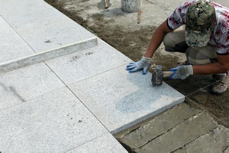 火燒板正式鋪貼:在正式板塊鋪貼時,先在水泥砂漿結合層上滿澆一層水灰比為0.5的素水泥漿,再將火燒板放置在水泥砂漿上用橡膠錘輕輕敲擊火燒板塊中間,使水泥砂漿振動擠壓密實。第一塊麻石火燒板鋪貼合格后,翻開火燒板,檢查砂漿結合層是否平整、密實。如果有空鼓現象,必須要增補砂漿,然后將板塊輕輕地對準原位放下,用橡皮錘輕擊放于板塊上的木墊板使板平實,根據水平線用水平尺找平,接著向兩側和后退方向順序鋪貼。鋪貼時必須隨時進行檢查,如果發(fā)現有空鼓現象,必須按照前面的步驟進行二次鋪貼。