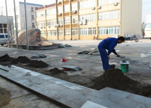 此次廣場麻石火燒板鋪裝的特別之處:根據甲方工程的合同要求,此鋪裝工程采用的是600*600*50mm麻石火燒板。首先此次工程施工面積超過一萬余平方,由于工程進度較為緊迫,公司決定此次鋪裝采用的是多個方位同時進行施工,這樣雖然可以加快施工進度,但是在多個方位進行結合的時候容易出現勾縫間距較大,錯縫,水平位高低差等現象。其次本工程采用的是600*600*50尺寸的麻石火燒板,此類規(guī)格的麻石火燒板重量較大,存在單個工人搬運困難,所以在火燒板卸載時必須考慮工人的搬運困難的實際情況,平均分布火燒板卸載地點,減少工人的搬運工作。而且5公分麻石火燒板比較厚實,在鋪裝過程中,采用一般的橡膠錘敲擊法施工可能要敲擊多次才能保證麻石火燒板的平整,如果敲擊不夠均勻還可能造成空鼓現象,這樣可能會造成鋪裝效率低的現象。最后本次施工采用的是C10臥漿鋪裝法,采用擊橡膠錘打法施工會比較考驗安裝師傅的手法,手法如果不夠純熟,容易出現水平位高低差現象,造成火燒板鋪裝不夠平整美觀。