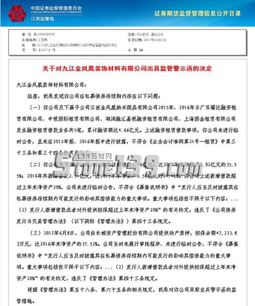 近日,記者查閱中國證券監(jiān)督管理委員會——江西局網(wǎng)站獲悉,九江金鳳凰裝飾材料有限公司因在私募債券存續(xù)期內(nèi)存在問題被江西證監(jiān)局采取出具警示函的監(jiān)管措施。
