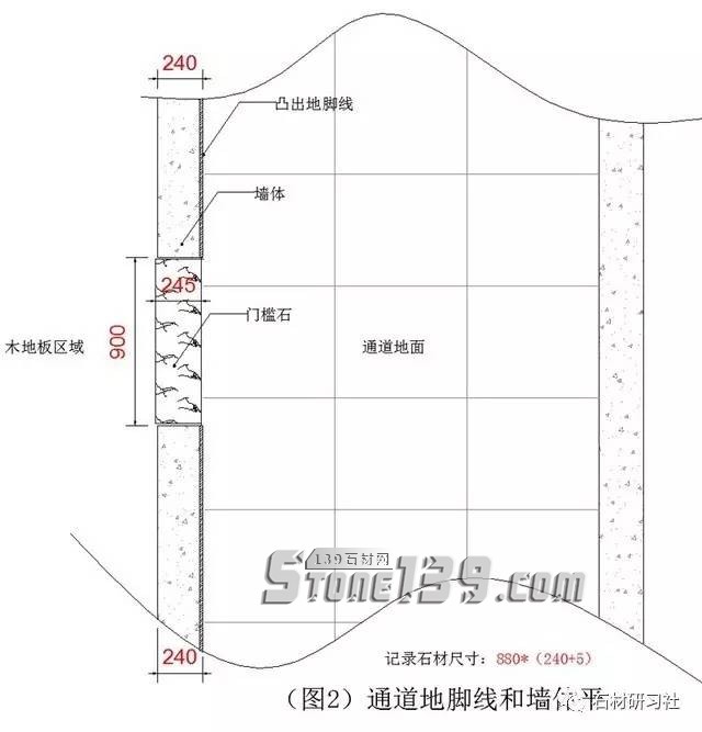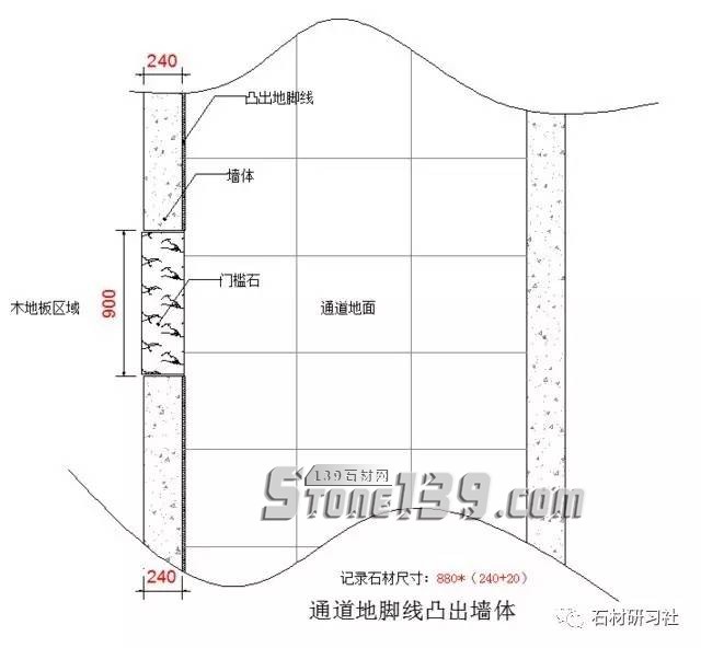 ▼第一個(這是一個通道和房間相連的門檻,地腳線是凸出來的樣式,測量記錄的尺寸是:880*(240+20),門洞的寬原尺寸是900減去了20是方便安裝時有空位,因為安裝房門時還可以遮住。墻厚原尺寸是240mm+20,兩邊各加10mm,因為石材地面(地板磚)和木地板安裝時都不可能緊靠密水泥墻,這也不方便安裝。所以需要加大尺寸來調(diào)節(jié),記錄240+20是一個技巧的問題,240是墻體,20是加大的尺寸,回去下單繪圖時不會忘記或出錯。