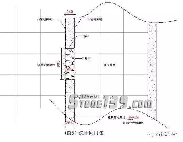 ▼第四個洗手間門檻(圖5是一個洗手間門檻,洗手間墻面如果還沒有貼磚,就事先和施工方溝通貼磚完成面是多少,才能測量記錄尺寸。我這里強調(diào)的是經(jīng)常出錯的就是沒有和客戶溝通好墻完成面,靠洗手間那一邊是否要加厚,磨邊肯定是要的的。我們作為專業(yè)的石材設計師,應該提議或提醒客戶需要磨哪一種邊最為恰當。我個人建議的是R2小圓邊和2*2的斜邊。)