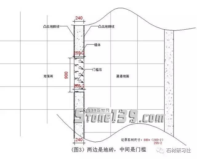 ▼第三個通道(圖3是一個墻面240厚,兩邊安裝師傅已經(jīng)鋪好了地磚,中間留出的一個空地方做門檻石,那就需要測量兩頭的尺寸然后再減去2mm,作為安裝移動空間,大理石不是木頭,剛好和大一點都安裝不了。這個門檻石大小頭,記錄尺寸是880*260(255)-2.)。