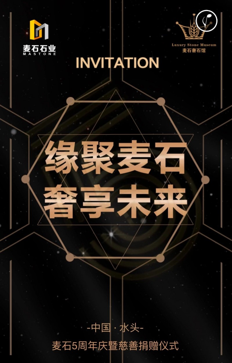 11月7日下午17:00,麥石石業將在麥石國際精品館舉行“緣聚麥石,奢享未來”麥石5周年慶暨慈善捐贈儀式,屆時將邀請領導嘉賓共同品鑒精美奢石,并舉行戰略簽約儀式。麥石石業為感謝5年來新老客戶的支持,在5周年慶典上將舉行慈善捐贈儀式,回饋社會。