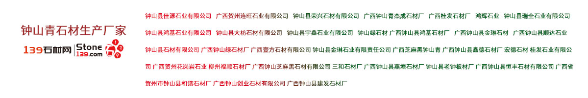 鐘山青石材生產(chǎn)廠家主要是指廣西省賀州市鐘山縣地區(qū)的鐘山青花崗巖生產(chǎn)加工廠家。部分鐘山青石材加工廠家 鐘山縣佳源石業(yè)有限公司 廣西賀州連旺石業(yè)有限公司 鐘山縣榮興石材有限公司 廣西鐘山青杰成石材廠 廣西桂發(fā)石材廠 鴻輝石業(yè) 鐘山縣瑞全石業(yè)有限公司 鐘山縣鴻基石業(yè)有限公司 鐘山縣大枋石材有限公司 鐘山縣宇鑫石業(yè)有限公司 鐘山綠石材 廣西鐘山縣鴻基石材廠 廣西鐘山縣金琳石材 廣西鐘山縣順達(dá)石業(yè) 鐘山縣石材有限公司 廣西鐘山綠石材廠 廣西壹方石材有限公司 鐘山縣金琳石業(yè)有限責(zé)任公司 廣西芝麻黑鐘山青 廣西鐘山縣鑫德石材廠 宏德石材 桂發(fā)石業(yè)有限公司 廣西賀州花崗巖石業(yè) 柳州福順石材廠 廣西鐘山芝麻黑石材有限公司 三和石材廠 廣西鐘山縣燕塘石材廠 鐘山縣老鐘板材廠 廣西鐘山縣恒豐石材有限公司 廣西省賀州市鐘山縣和諧石材廠 廣西鐘山創(chuàng)業(yè)石材有限公司 廣西鐘山縣建發(fā)石材廠